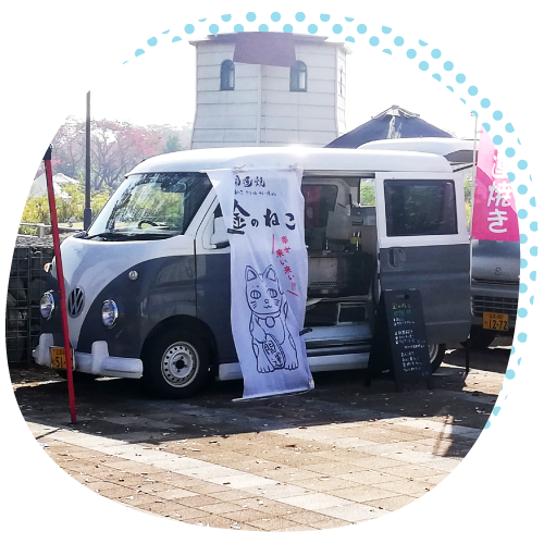 招きねこ型大判焼きやみたらし団子、ポン菓子等販売。
