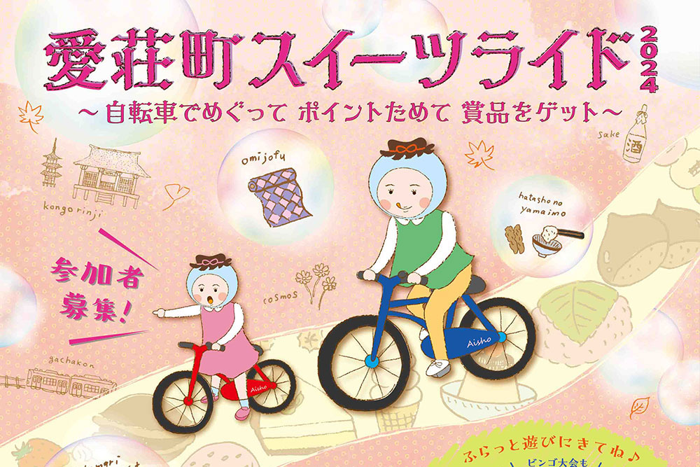 9:00〜16:00オリジナルマップをもとに自分の自転車で愛荘町のスイーツ店や観光スポットを巡り、獲得ポイントに応じて、賞品がゲットできるイベントです。スタート会場となるラポール秦荘では「秋の味覚を食べ歩き『愛荘うまいもん秋まつり』」としてマルシェも開催!