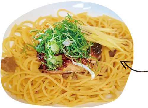 長浜市の郷土料理として親しまれる「焼き鯖そうめん」をアレンジしたスパゲティ。